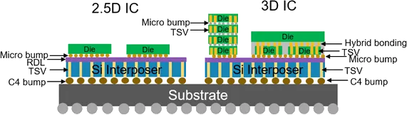 Advanced Packaging is the core technology for breaking through the physical limits of Moore's Law and continuously improving chip performance. Unlike traditional packaging, which only provides mechanical protection and basic conductivity, it focuses on Heterogeneous Integration, integrating chips with different processes and functions (such as CPU, GPU, and HBM) with extremely tight spacing to achieve low power consumption, high bandwidth, and small footprints. Currently, the mainstream technologies are 2.5D packaging and 3D packaging. 2.5D packaging, such as CoWoS, places system-on-a-chip (SoC), memory and other chips on a silicon interposer. They are linked via RDL and micro bumps for smooth electronic signal transmission, then connects them to the underlying substrate through silicon interposer and C4 bumps. 3D packaging, chips are vertically stacked and connected via micro bumps or hybrid Bonding. These stacks connect to the interposer through TSV (Through-Silicon Via) and micro bumps. Hybrid bonding, with its bumpless design, offers unprecedented interconnect density.