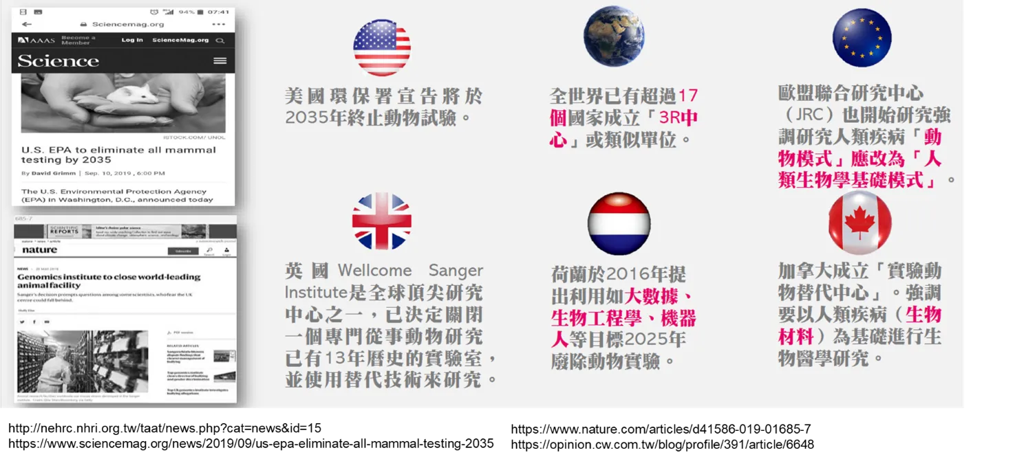 行政院於2022年啟動臺灣動物實驗替代科技跨部會平台,整合中研院、國科會、農委會、衛福部、環保署、教育部、經濟部之能量,部署三大主軸- 「替代科技研發」、「減量策略與驗證平台建置」、「優化動物實驗管理」,期能加速建立可以和動物實驗互補搭配的替代技術,推升生醫研究品質與監管風險評估效能。隨著科技日新月異,跨領域的動物實驗替代科技 (alternative technologies to animal testing)逐漸成形,搭配幹細胞、3D列印、組織培養、微流道、感測晶片、人工智慧等新興科技,啟動了嶄新的離體生醫研究模式。