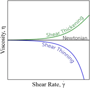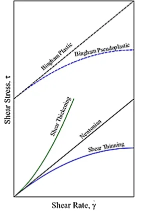 實際上,大多數流體都是非牛頓流體,這意味著它們的黏度取決於剪切率(剪切稀化或增稠)或形變史(觸變流體)。與牛頓流體相比,非牛頓流體在剪切應力和剪切速率之間顯示出非線性關係(見圖 1),具有屈服應力(yield stress),依賴於時間或形變史的黏度。