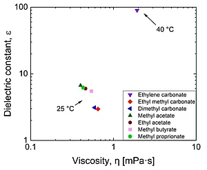 介電常數定義為溶液分子被局部電場極化的方式的反映。這意味著更高的介電常數溶劑更容易將鹽結合成組成離子,從而使溶液中產生更高的離子濃度和更高的電導率。為實現高導電性,要尋找具有低黏度和高介電常數的配方。