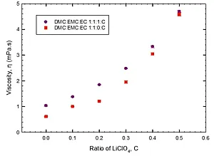 黏度取決於電池的特性,例如離子的大小、離子的溶劑、電解質的性質和溶劑的性質。電池的電導率和性能將取決於黏度和介電常數。遷移率與黏度和離子大小成反比,因此黏度越高,電導率越低。