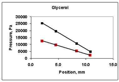 低濃度和高濃度甘油樣品的壓力與位置函數關係