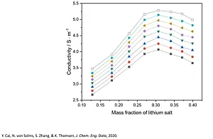電池電導率隨著鋰鹽濃度 (LiClO4) 的增加而增加,但在達到某個閾值後,電導率會隨著鹽濃度的增加而降低,因為在此濃度範圍內的電導率主要受溶液黏度的影響,溶液黏度會隨著鹽濃度的增加而增加。