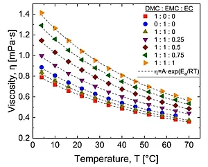 在一項監測溫度、鹽濃度和溶劑濃度如何影響黏度的實驗中,RheoSense 團隊使用 VROC ® initium one plus 自動黏度計測量了包含不同比例的 DMC、EMC、EC 的各種電解質系統。我們的實驗表明,隨著溫度的升高,各種樣品的黏度都會降低。它還表明,當您將 EC 添加到溶液中時,黏度會增加,並且黏度越大的混合物隨著溫度的升高黏度下降得越快。