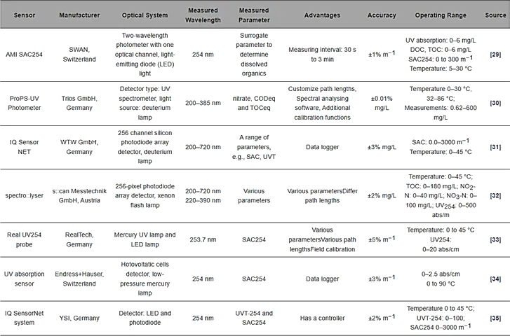 隨著光電探測器的發展,在線紫外-可見分光光度計的種類越來越多。根據不同的檢測技術和儀器設計開發的各種 UV-Vis 傳感器可用於水質監測和過程控制。紫外-可見分光光度法的原理是根據水中能吸收特定波長紫外-可見光的物質分子以及吸收光譜與物質濃度的相關性。這些傳感設備通常不需要樣品過濾,無需試劑,可以快速測量水質。表 1總結了常用的市售在線UV-Vis儀器。這些儀器主要有兩類:單波長(SW)和光譜(全波長或部分波長)。