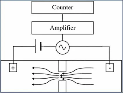 庫爾特計數器也許是最流行的常規粒子計數方法。其測量原理是利用電阻脈衝法,適用於一些微流體粒子計數。Coulter Counter 最早由 Wallace H. Coulter 在二戰期間發明並獲得專利(Coulter 1953)。當庫爾特為美國海軍工作時,他使用這種技術來計算浮游生物粒子的數量,這些粒子總是在聲納上引起大的迴聲。在庫爾特計數器中,壁上的小孔浸入容器中,容器中的顆粒懸浮在低濃度電解質溶液中。放置兩個電極:一個在孔的前面,一個在孔的後面,當施加電場時,電流路徑由電解質提供(圖)。當顆粒通過孔時,相當於顆粒浸入一定體積的電解質從傳感區移出。這會導致孔徑上的阻抗發生短期變化。這種變化可以以電壓脈衝或電流脈衝來測量。脈衝高度與感測粒子的體積成正比。如果假設粒子密度恆定,則脈衝高度也與粒子質量成正比。因此,該技術也稱為孔徑技術。