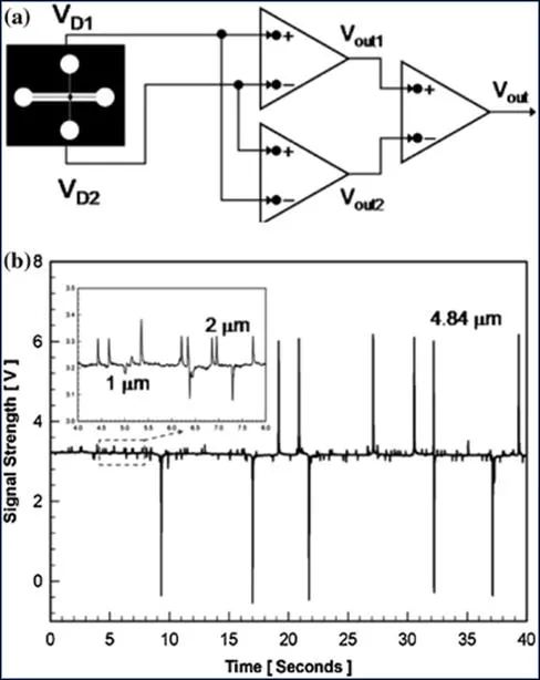 為了提高靈敏度,Xu 等人和 Sridhar 等人使用16μm 的相對較寬的聚二甲基矽氧烷(PDMS)通道和金屬氧化物半導體場效應晶體管 (MOSFET)。他們通過監測MOSFET漏極電流調製而不是通過傳感通道的離子電流調製來檢測粒子。最近,Wu 等人開發了一種利用鏡像對稱通道結構和兩級差分放大器的微流體RPS方法(圖)。它們可以實現更好的信噪比。