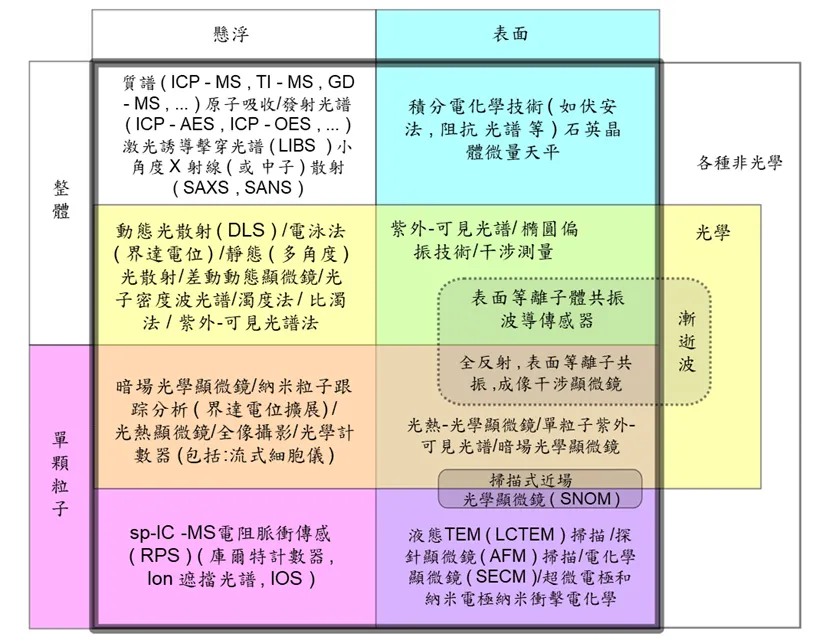 根據奈米材料的狀態和濃度,可能適用非常不同的分析技術。奈米材料通常以粉末或懸浮液兩種形式生產、供應和消費。通常,粉末代表顆粒形式的物質。奈米粉末在很大程度上(在許多情況下幾乎完全)僅由奈米材料組成。相反,奈米顆粒懸浮液通常含有微量的NP。顯然,如果 NPs 牢固地固定在固體結構中,可以在特定粘度的液體介質中自由移動,或者分散在氣態環境中,則測量方法會有所不同。分析NPs有光學與非光學方法。在許多情況下,相同的技術可以應用於液態或固態,或者NPs可以從固相轉移到液相並進行研究,也可以組合幾種檢測方式,得到可靠的分析數據。簡介幾個方法供大家參考。
