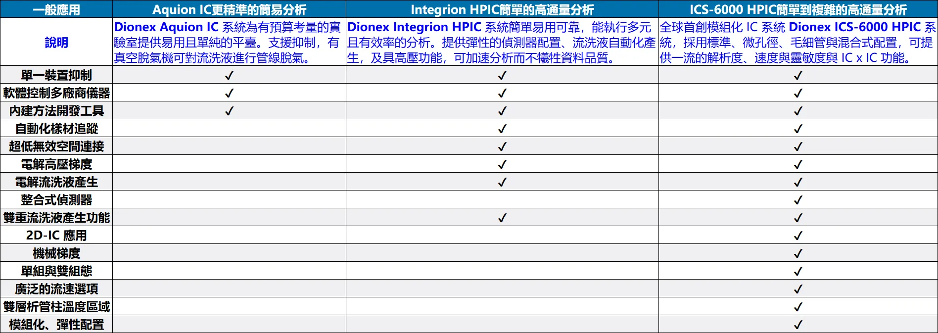 Thermo Scientific Dionex™ IC系統應不同需求已經發展出許多的產品,每個系列產品都具備優異的性能,更佳的可靠性和更容易的操作模式。高壓IC系統具備優異的靈活性,模組化設計以及操作簡單的特性,完美達成高光譜解析度和方便性。Reagent Free™ IC可大幅減少沖提液準備和再生溶劑製備的日常工作,節省時間,防止錯誤,增加方便性。
